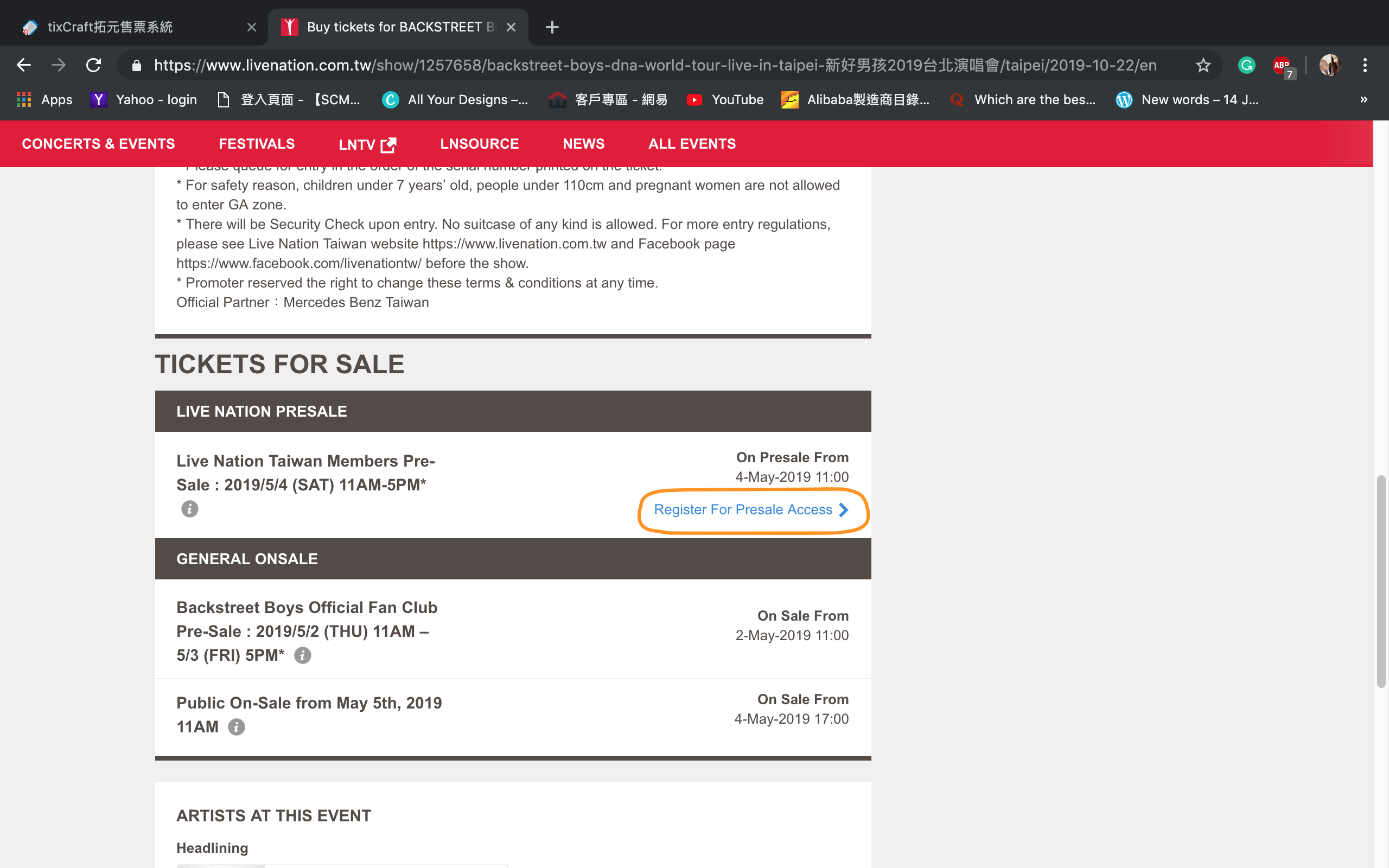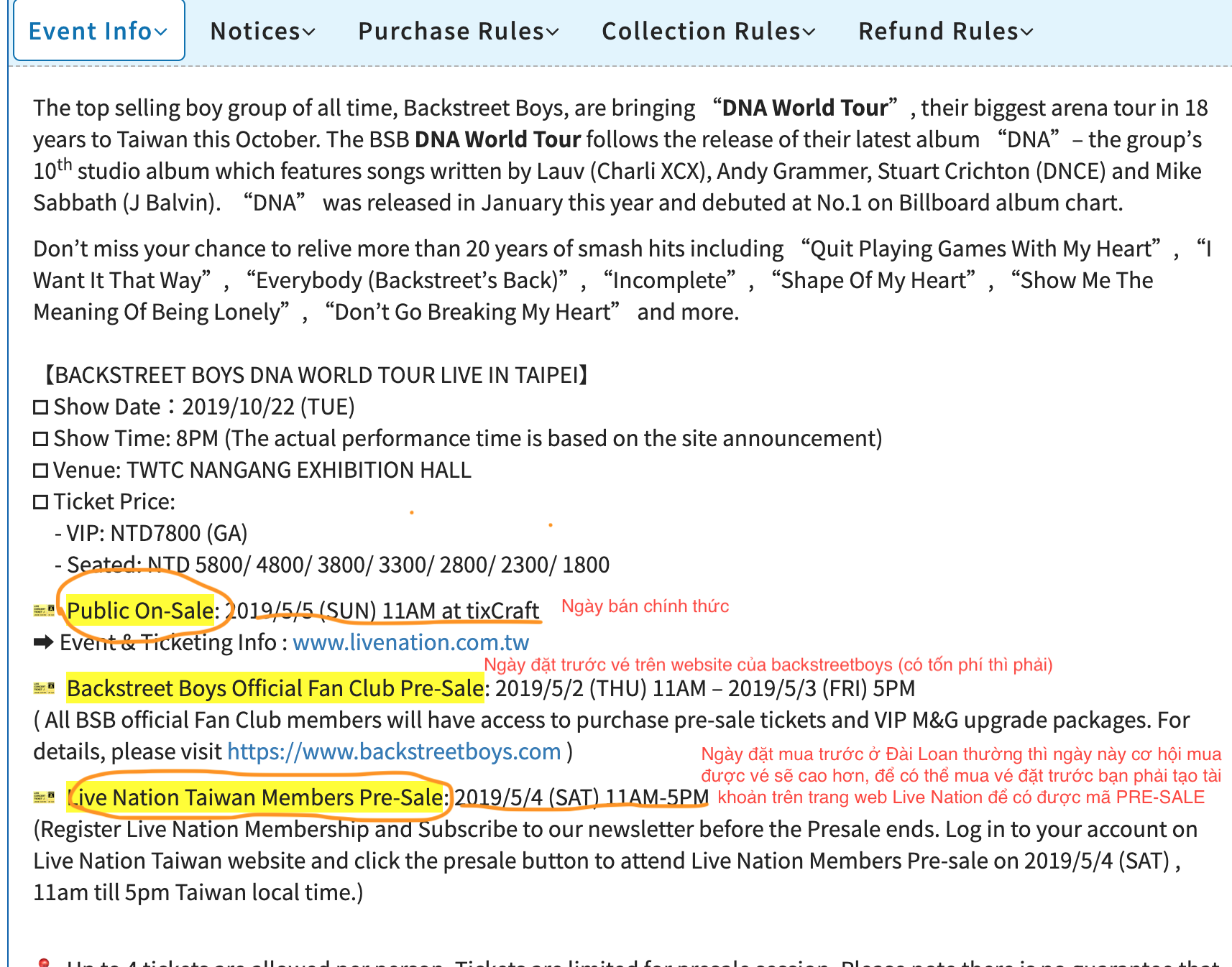 - Dưới đây mình khoanh vùng hai nhóm nhạc, một nhóm đã mở bán chính thức là WESTLIFE, và một nhóm sắp mở bán là BACKSTREETBOYS để làm ví dụ cho các bạn thấy rõ các bước mua vé như thế nào. Lưu ý, BACKSTREETBOYS ngày presale là ngày 4 tháng 5 năm 2019 lúc 11 a.m đến 5:00 p.m, ngày bán chính thức là một ngày sau đó 5/5/2019