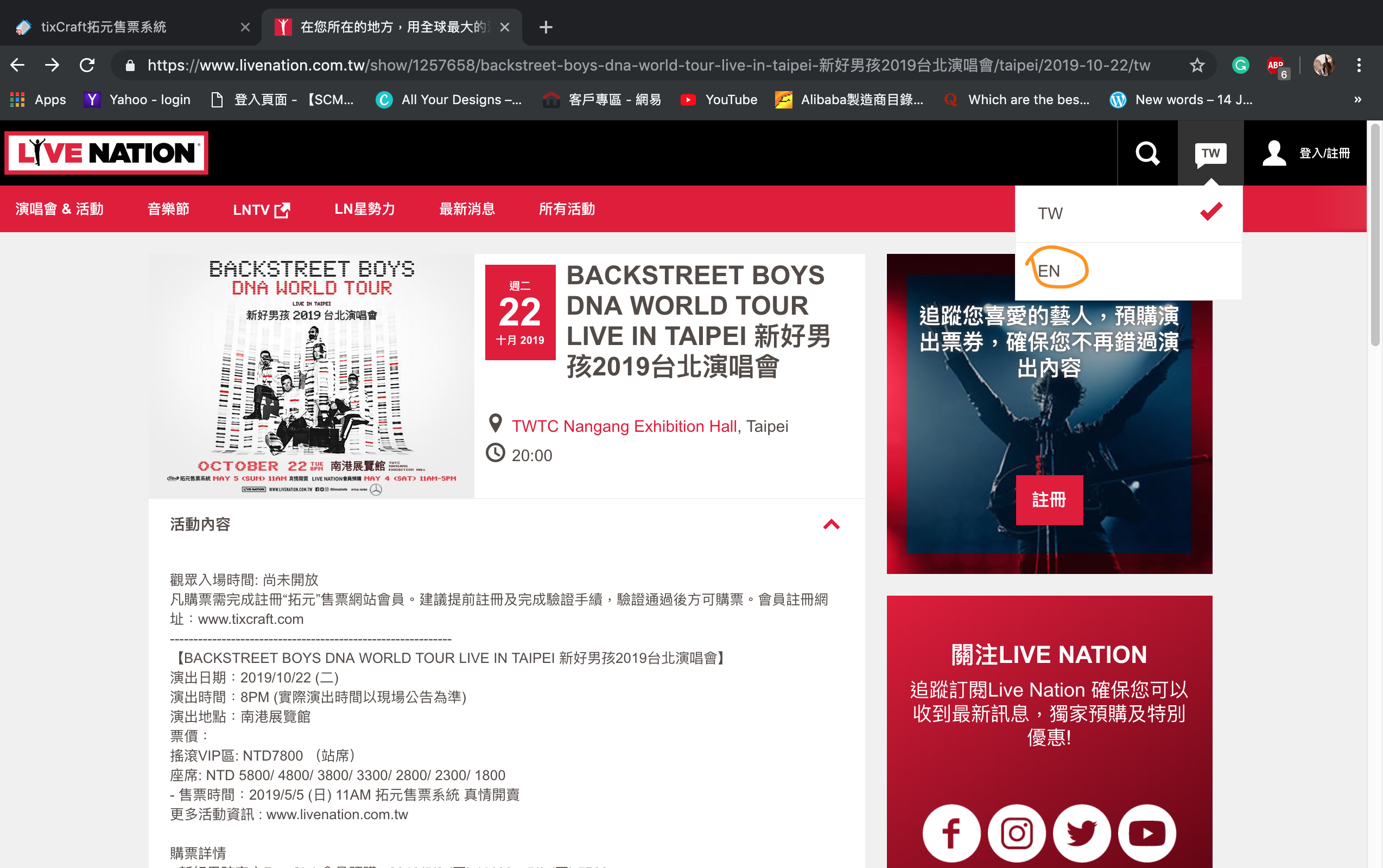 - Đầu tiên, các bạn cũng đổi ngôn ngữ hiện thị qua tiếng anh, chọn nhóm nhạc bán mua mua vé.