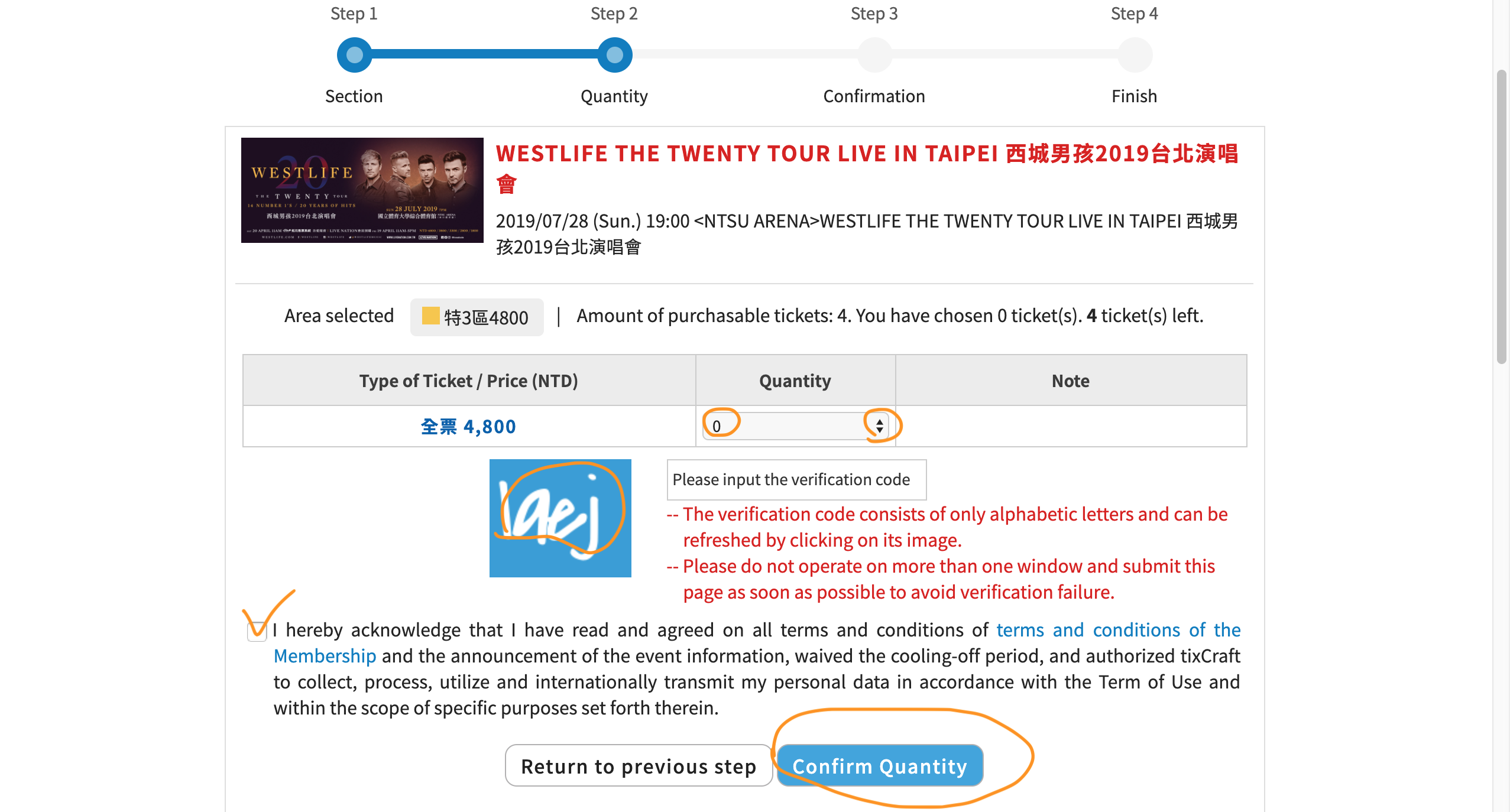 - Sau khi kiểm tra đúng số lượng vé, đúng khu vực vé bạn nhấn ” Confirm Quantity”