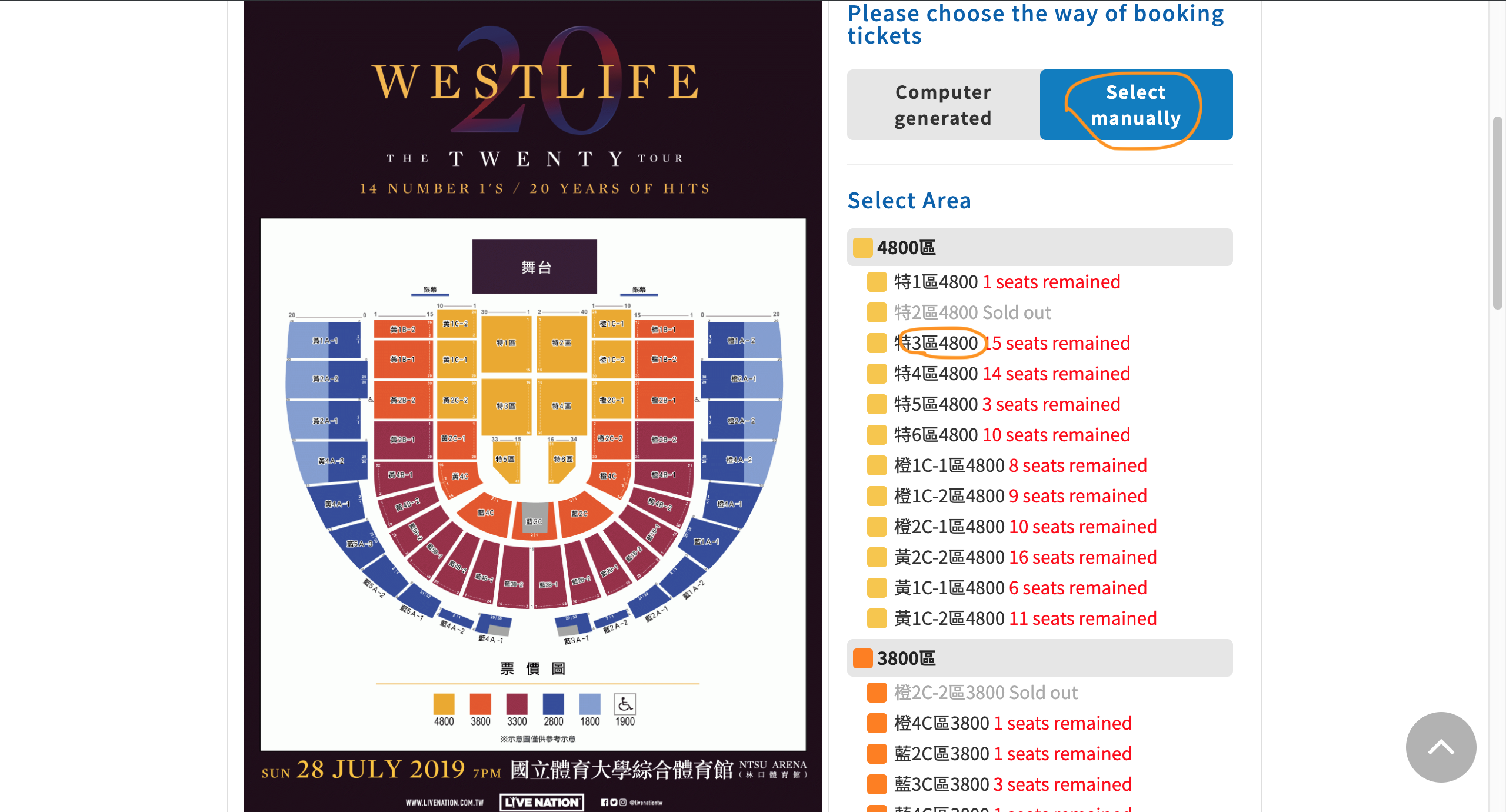 - Các bạn đổi qua chọn ô ” Select manually”, như hình phía trên. Sau đó bấm vào khu vực bạn muốn chọn mua vé.