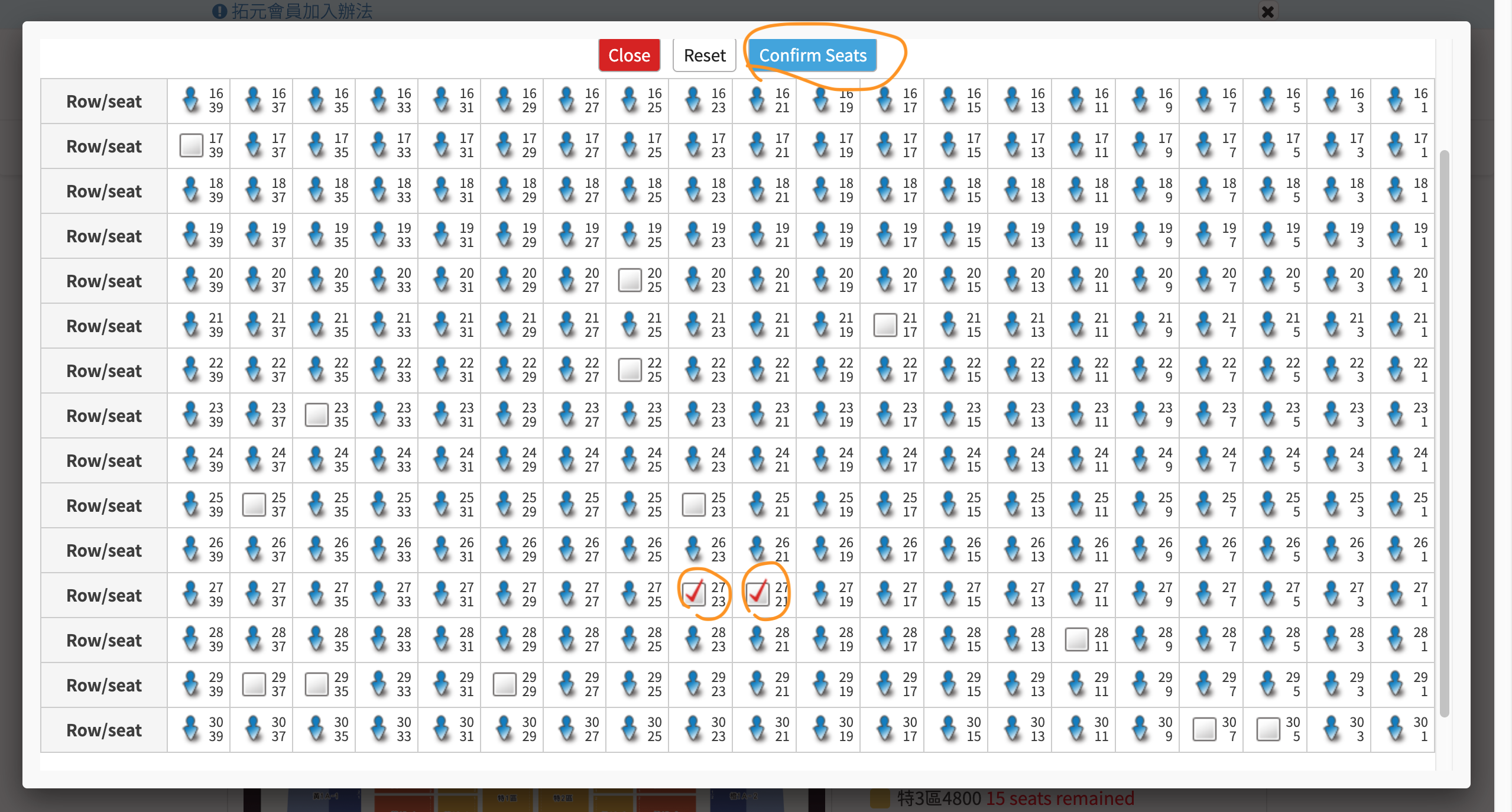 - Sau đó, sẽ hiện ra màn hình như bên dưới, bạn chọn bấm chọn chỗ nào thì nó sẽ hiện dấu V màu đỏ, sau khi chọn xong bạn bấm nút “Confirm Seats”.