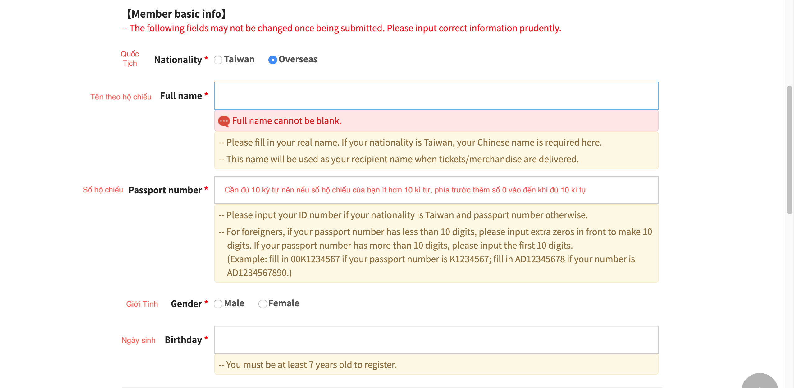 - Cuối cùng, ở bước tạo tài khoản này là bạn nhập thông tin theo yêu cầu như mình có ghi chú trong hình. Nếu là người nước ngoài (bao gồm người Việt ) thì chọn “Overseas”
